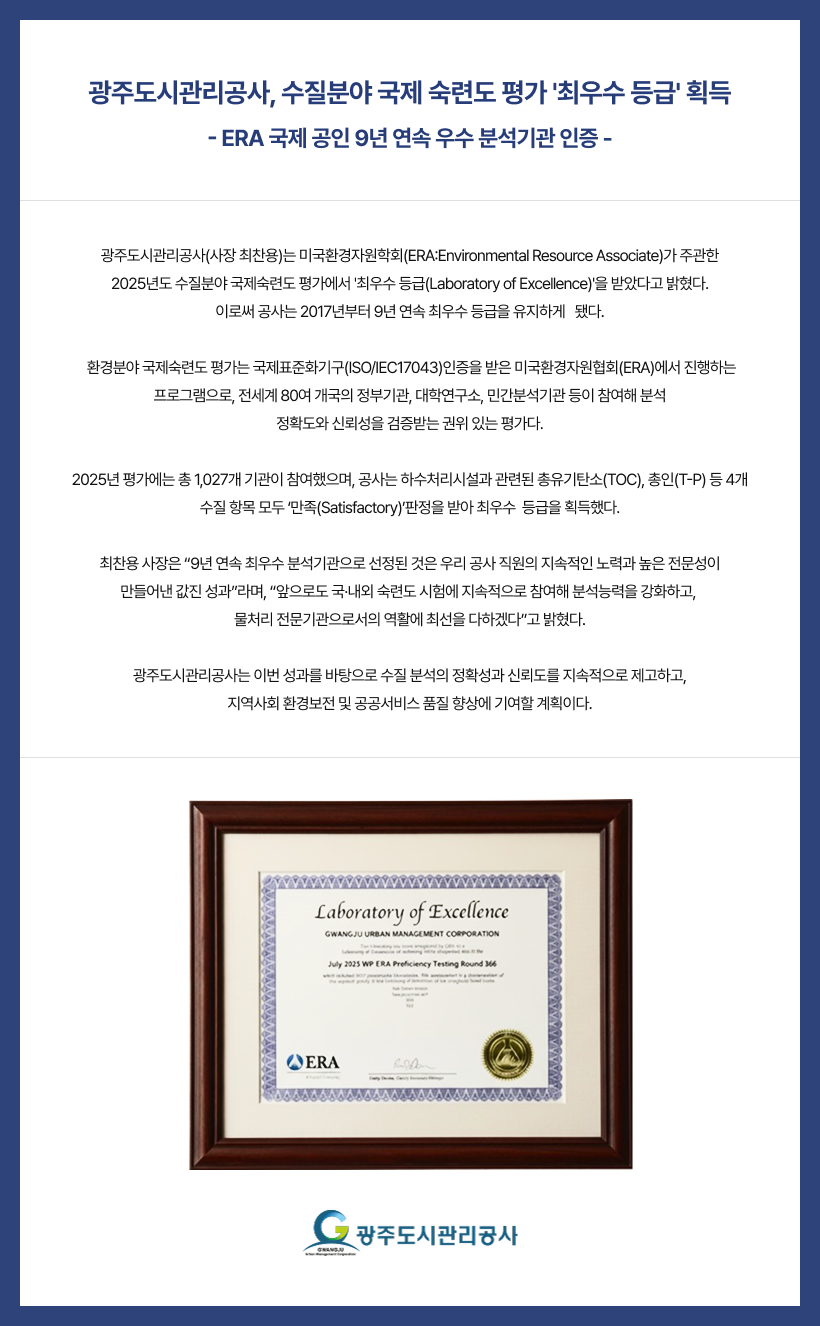 광주도시관리공사, 수질분야 국제 숙련도 평가 '최우수 등급' 획득