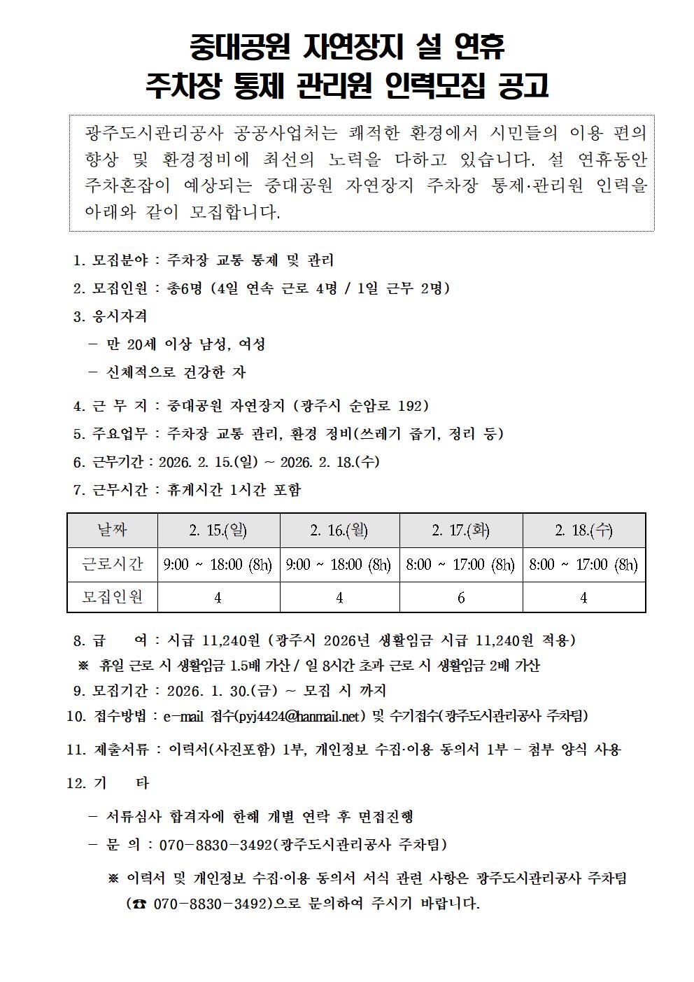 중대공원 자연장지 설 연휴 주차장 통제 관리원 인력모집 공고